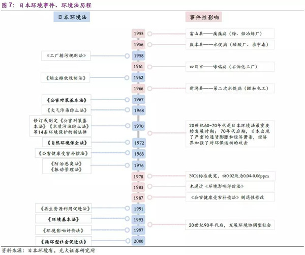 20世紀50-70年代,日本快速實現(xiàn)工業(yè)化,經(jīng)濟成就舉世矚目,但期間各類公害事件頻發(fā),成為了尖銳的社會和政治問題。在此背景下,以1967年《公害對策基本法》為核心的環(huán)保法律體系應(yīng)運而生,日本環(huán)保產(chǎn)業(yè)開始了上升周期。雖然環(huán)保政策在80年代初經(jīng)濟下行時稍有反復(fù),但也僅是過程中的擾動。隨著工業(yè)化及城鎮(zhèn)化達到一定階段,日本末端治污需求逐漸減弱,2000年以《循環(huán)型社會促進法》為核心的法律體系應(yīng)運而生,日本大力推進循環(huán)經(jīng)濟的國策,以減輕自身由于資源匱乏的限制,實現(xiàn)了法律體系由“被動”到“主動”的過程。