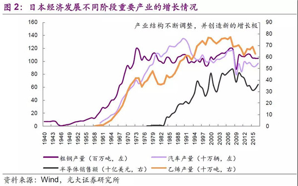 20世紀70年代起,尼克松沖擊、兩次石油危機以及廣場協(xié)議,致日本經(jīng)濟面臨較大的考驗。1974年是日本經(jīng)濟第一個重要的分界點,對于資源貧乏和市場狹窄的日本來說,期初人口及原材料廉價的優(yōu)勢已經(jīng)消失,只有通過產(chǎn)業(yè)結(jié)構(gòu)的升級,發(fā)展節(jié)能和精細化高附加值的產(chǎn)品,才能實現(xiàn)日本企業(yè)競爭力進一步提升。在此期間,日本汽車、半導(dǎo)體產(chǎn)業(yè)的騰飛便是一個很好的例子,新的增長極的出現(xiàn),也將石油危機、資源約束的影響降到較低的水平。