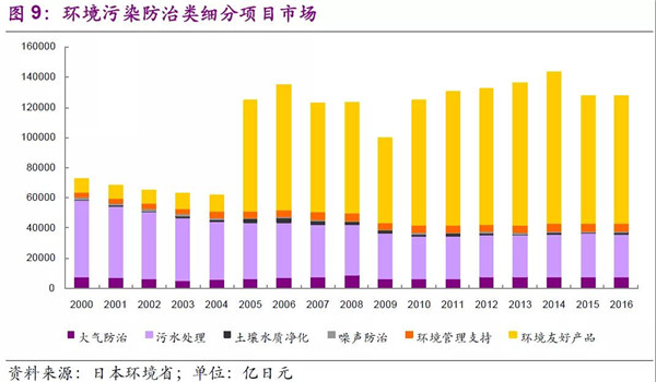 以日本環(huán)境省統(tǒng)計口徑,環(huán)境污染防治包括:大氣污染防治、污水處理、土壤及水質(zhì)凈化、噪聲防治、環(huán)境管理支持、環(huán)境友好產(chǎn)品。