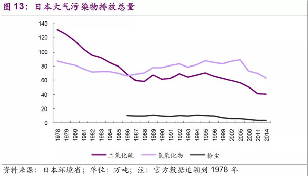 從大氣污染排放總量上來看,日本20世紀70-80年代二氧化硫排放總量快速下降,這與期間法律法規(guī)的完善,煙氣脫硫力度增加有很大關(guān)系,而且治理效果很明顯,說明一般固定排放源安裝脫硫設(shè)施便可以達到較好的效果。