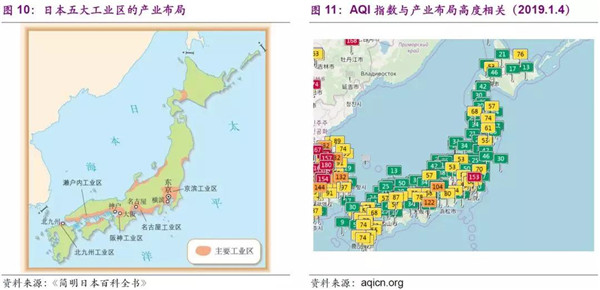 日本大氣污染始于工業(yè)化進程,產(chǎn)業(yè)密度和布局很關(guān)鍵,AQI指數(shù)也與工業(yè)化進程相關(guān)性較強。日本主要工業(yè)區(qū)集中在太平洋沿岸的帶狀地帶:即京濱(東京——橫濱)、名古屋(名古屋為中心)、阪神(大阪——神戶)、瀨戶內(nèi)海(瀨戶內(nèi)海沿岸)和北九州五大工業(yè)區(qū)。