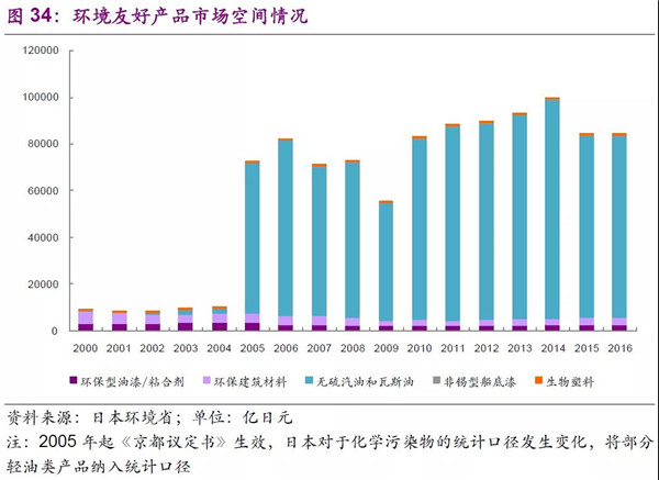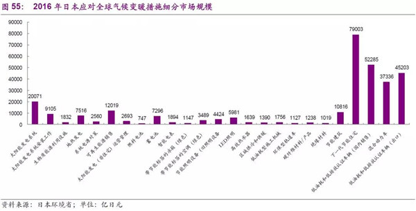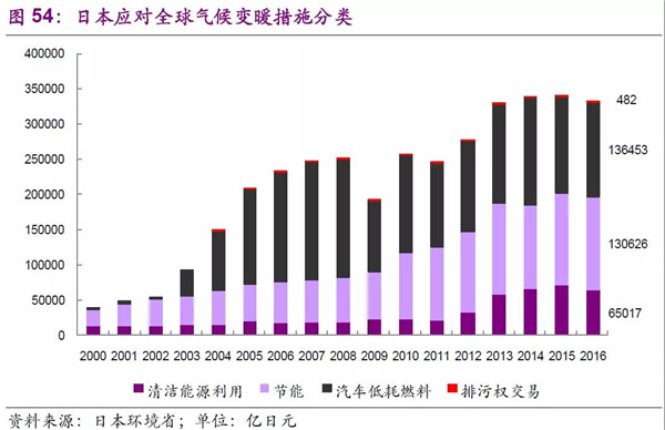 在日本應(yīng)對全球氣候變暖措施分類上,主要有清潔能源利用、節(jié)能、汽車低耗燃料等具體措施,2016年整體的市場空間可以達33萬億日元(日本環(huán)境省數(shù)據(jù))。具體細分來看,以2016年為例,節(jié)能建筑、低油耗低排放及混合動力車輛、太陽能產(chǎn)業(yè)、蓄電池、節(jié)能照明設(shè)施等是未來重要的發(fā)展方向。