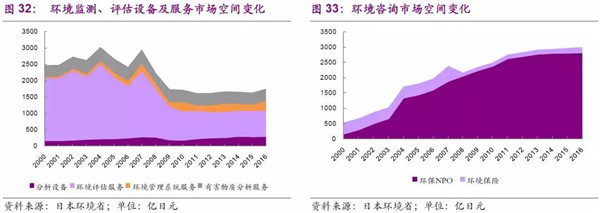 在環(huán)境支持管理科目分為很多細項,如環(huán)境監(jiān)測、評估設(shè)備及服務(wù)和環(huán)境咨詢市場。日本基本已經(jīng)建成較為全面的環(huán)境監(jiān)測體系,因此近些年來設(shè)備需求相對穩(wěn)定,2016年為291億日元;更多的市場需求以服務(wù)為主,其中2016年,環(huán)境評估為792億日元市場空間,環(huán)境管理系統(tǒng)服務(wù)為313億日元市場空間,有害物質(zhì)分析服務(wù)為353億日元市場空間。