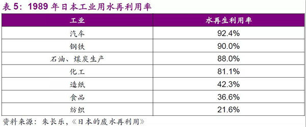 日本工業(yè)用水消耗量隨工業(yè)化發(fā)展迅速提升,1989年工業(yè)水消耗量達到1.44億立方米/日,耗水大戶為化工、鋼鐵、造紙,占總量約70%左右。1965年工業(yè)水的再利用率僅為36%,日本從改革生產(chǎn)工藝入手,盡量采用資源利用率高、污染物排放量少的先進工藝,最大限度地利用水資源,使得再利用率在1975年達到67%、1989年進一步達到76%;行業(yè)方面,汽車、石油、煤炭工業(yè)和化學(xué)工業(yè)都具有高水再生利用率,而紡織、食品、造紙工業(yè)的水再生利用率較低,原因在于前者冷卻、空調(diào)等用水易于回收,而后者常為洗滌用水,較難以處理。(朱長樂,《日本的廢水再利用》)