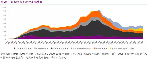 從污水處理市場空間分析:工業(yè)污水設(shè)備的需求體現(xiàn)了工業(yè)化以及法規(guī)發(fā)展過程,日本的工業(yè)污水處理市場在70年代達到一個高峰,后期相對平穩(wěn);而生活污水處理設(shè)備及市政設(shè)施建設(shè)則與城鎮(zhèn)化、房地產(chǎn)周期以及法規(guī)發(fā)展過程相關(guān),日本的生活污水處理市場則在20世紀90年代中后期達到高峰;海洋污染防治在2011年開始受重視,設(shè)備需求在逐步提升的過程中。