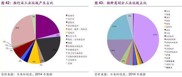 按行業(yè)劃分分析工業(yè)垃圾產(chǎn)量:公用事業(yè)行業(yè)產(chǎn)生垃圾最多,占比最高26%,其次為農(nóng)林業(yè)和建筑業(yè)均為21%;按種類劃分污泥占比最高,達到43%,其次為動物糞便為21%,再次是瓦礫占比為16%。從分類來看,產(chǎn)生行業(yè)和垃圾種類能夠較好的對應(yīng)上。
