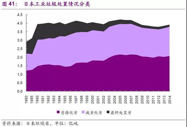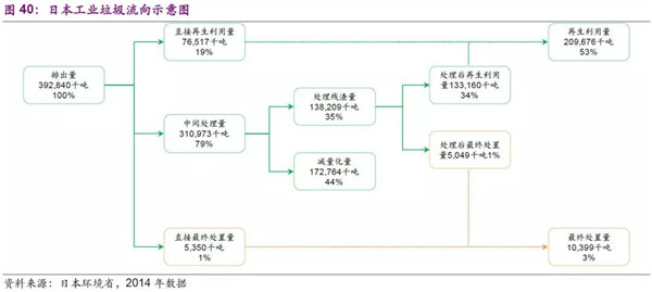 日本工業(yè)垃圾處理更為深刻的踐行了循環(huán)型社會路線,根據(jù)2014年日本環(huán)境省數(shù)據(jù),工業(yè)垃圾排放量為3.92億噸,資源化、減量化、最終處置量分別為2.10、1.72、0.10億噸,其中資源化占比高達53.6%。