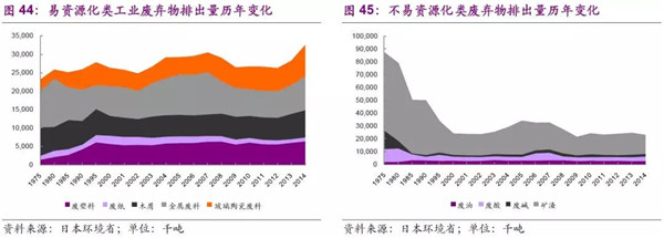 以易資源化和不易資源化來劃分工業(yè)垃圾產(chǎn)生量:易資源化廢棄物主要隨著日本工業(yè)化和城鎮(zhèn)化興起而產(chǎn)量增加,同時即便在經(jīng)濟周期的下行周期,其變化也并不是很顯著;而不易資源化的工業(yè)垃圾如部分重工業(yè)產(chǎn)生的廢酸、廢堿、礦渣等排出量卻會隨著經(jīng)濟周期的下行發(fā)生一定幅度的減少。這也說明在20世紀80年代后期,日本的產(chǎn)業(yè)結(jié)構(gòu)正逐漸發(fā)生著變化,傳統(tǒng)的重污染行業(yè)正在逐漸減少或進行節(jié)能環(huán)保轉(zhuǎn)型、新興產(chǎn)業(yè)正在興起。