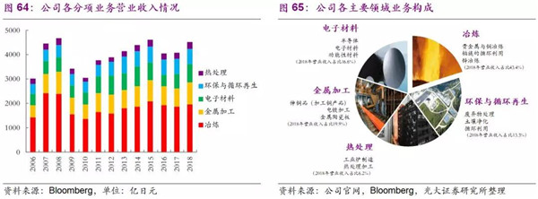 公司從1884年秋田縣小坂礦山起步,逐步發(fā)展到從金屬的生產(chǎn)開始到高附加價值產(chǎn)品的制造、以及廢棄物的處理及循環(huán)利用,開展著特有的循環(huán)型事業(yè)活動,這也契合了當前日本綠色發(fā)展的產(chǎn)業(yè)要求。公司目前共有五大服務(wù)領(lǐng)域:環(huán)保與循環(huán)再生、冶煉、電子材料、金屬加工、以及熱處理,2018年營業(yè)收入達4548億日元,各業(yè)務(wù)營業(yè)收入占比相對穩(wěn)定,其發(fā)家的冶煉業(yè)務(wù)營業(yè)收入占比常年保持在40%以上。