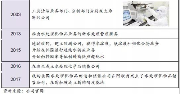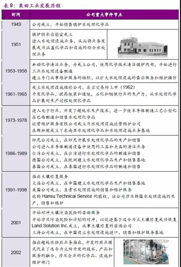 公司起步于鍋爐清洗化學(xué)品銷售,在成立早期雖經(jīng)歷一定坎坷,但最終公司的技術(shù)和產(chǎn)品逐漸被市場認可,成為市場的主導(dǎo)產(chǎn)品。伴隨日本工業(yè)化進程發(fā)展,1953年后公司的業(yè)務(wù)范圍不僅局限于化學(xué)品產(chǎn)品,也開始進入設(shè)備領(lǐng)域,尤其是在水處理設(shè)備市場,如:離子交換樹脂、水軟化及純水設(shè)備是公司具有核心競爭力的產(chǎn)品。公司通過不斷學(xué)習(xí)并獲取過濾設(shè)備、流量控制等多項技術(shù),逐步確立了鍋爐水供應(yīng)的市場地位。