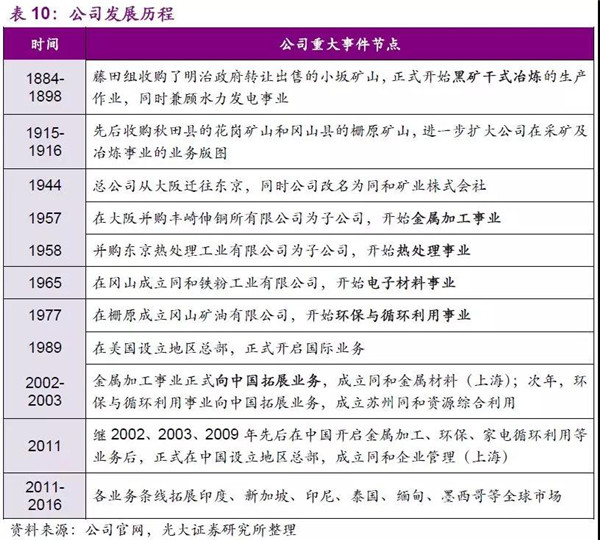 同和控股的歷史可以追溯到1884年,當時藤田組收購了政府轉(zhuǎn)讓出售的秋田縣小坂礦山后,從采礦及冶煉事業(yè)開始起步,先是通過不斷的收購礦山壯大其在采礦及冶煉事業(yè)的業(yè)務(wù),隨后抓住時代變遷的機遇,先后涉獵金屬加工、熱處理、電子材料、以及環(huán)保等其他領(lǐng)域,目前已形成了由五大核心事業(yè)部構(gòu)成的有著“產(chǎn)—供—銷—收”全過程產(chǎn)業(yè)鏈的循環(huán)性事業(yè)。