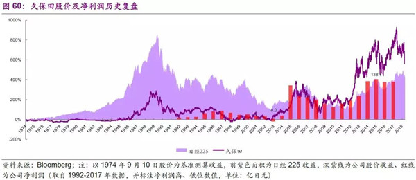 我們對公司1974-2018年的股價及凈利潤進行了復(fù)盤。公司作為的全球農(nóng)業(yè)機械和環(huán)境領(lǐng)域設(shè)備制造商,受經(jīng)濟周期性影響較為顯著,具有典型的周期股屬性。公司上市后的早期階段持續(xù)跑輸大盤,在20世紀80年代末資產(chǎn)泡沫階段,表現(xiàn)也較為低迷;2003-2007年全球經(jīng)濟繁榮,尤其是中國和北美的業(yè)務(wù)帶動公司業(yè)務(wù)進一步發(fā)展,公司業(yè)績穩(wěn)步提升(2005年的業(yè)績提升主要系收到了586億日元養(yǎng)老金替代計劃的政府補助),股票開始獲得超額收益;隨后受次貸危機影響,公司股價隨業(yè)績同步走低,直到2012年后日元貶值至出口轉(zhuǎn)好,疊加全球經(jīng)濟回暖北美和東南亞銷售回暖,公司在2013-2014年的業(yè)績才顯著轉(zhuǎn)好;此后公司股價隨日本股市整體上漲,表現(xiàn)優(yōu)異至今。