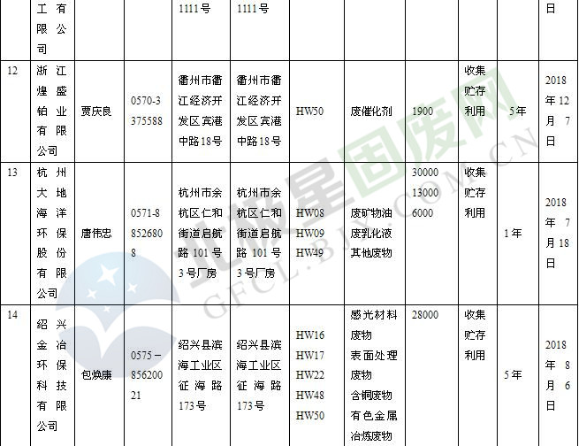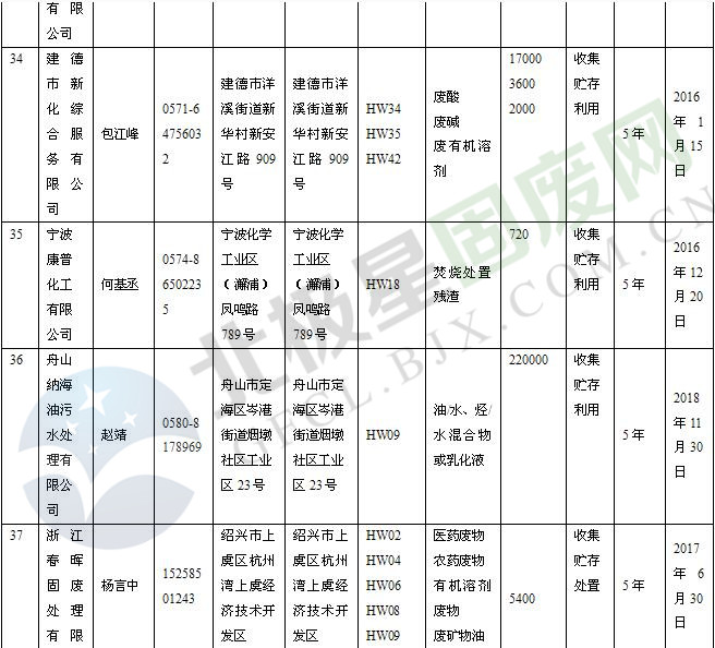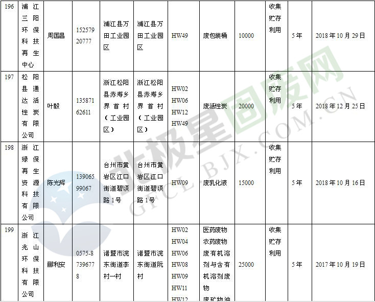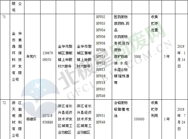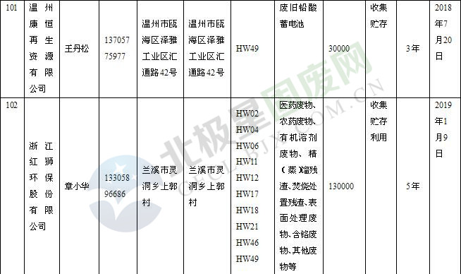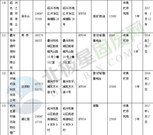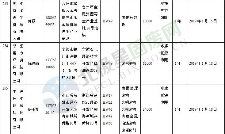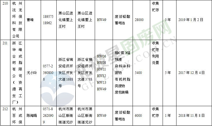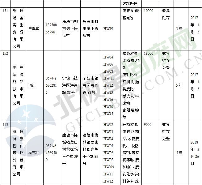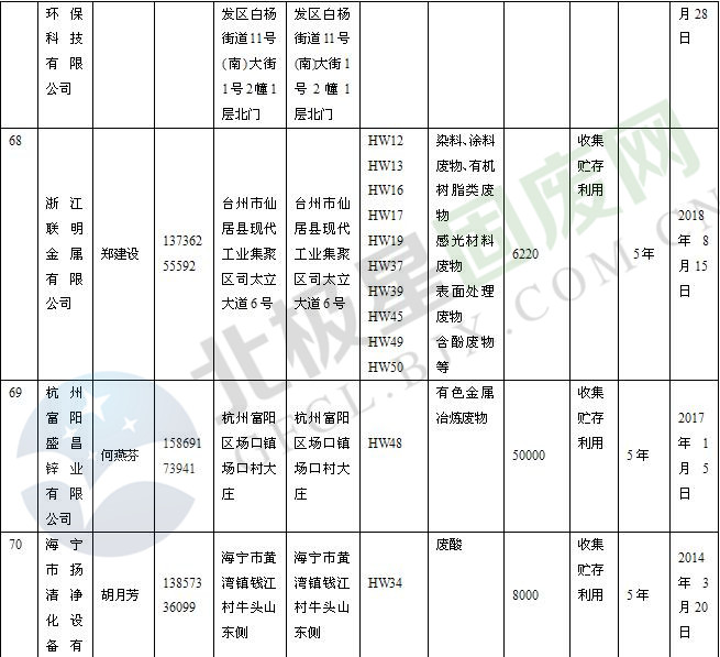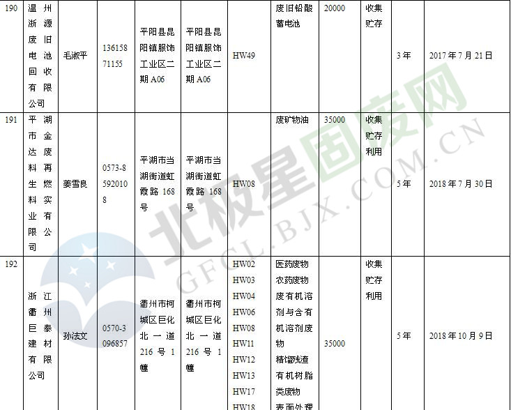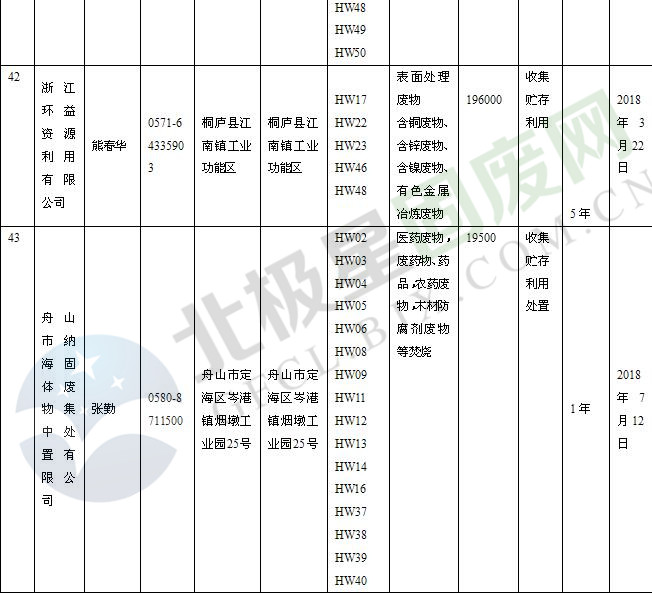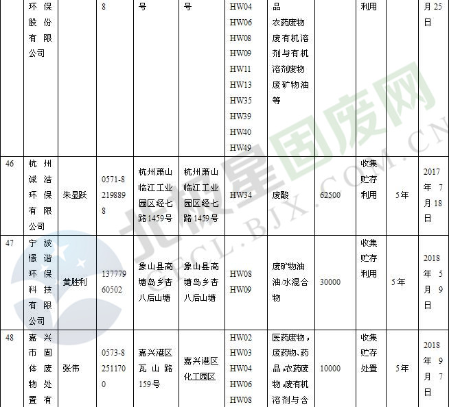本文整理了浙江省截止至2019.1.22的危險廢物經(jīng)營單位,詳情如下: