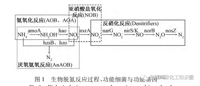 生物脫氮過程的主要功能微生物包括氨氧化細(xì)菌( Ammonia oxidizing bacteria,AOB) 、氨氧化古菌( Ammonia-oxidizing archaea,AOA) 、亞硝酸鹽氧化菌( Nitrite oxidizing bacteria,NOB) 、AnAOB和反硝化細(xì)菌( Denitrifier) 等,其轉(zhuǎn)化機(jī)制如圖1所示。