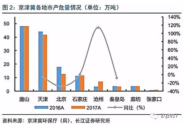 京津冀地區(qū)受到供給側(cè)改革影響預(yù)計(jì)產(chǎn)業(yè)轉(zhuǎn)移規(guī)劃[1],總體空間有限,河北空間相對(duì)明顯:近三年的危廢產(chǎn)量呈現(xiàn)遞減趨勢(shì),預(yù)計(jì)未來京津冀的危廢增量趨于平緩,區(qū)域總體增量空間有限。相對(duì)而言,基于十三五規(guī)劃目標(biāo)(新增能力3.3倍),河北省的危廢市場(chǎng)存在一定的市場(chǎng)空間,但總體依然有限,未來的處置重點(diǎn)為廢酸、制藥行業(yè)廢菌渣。