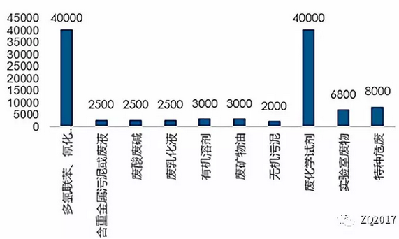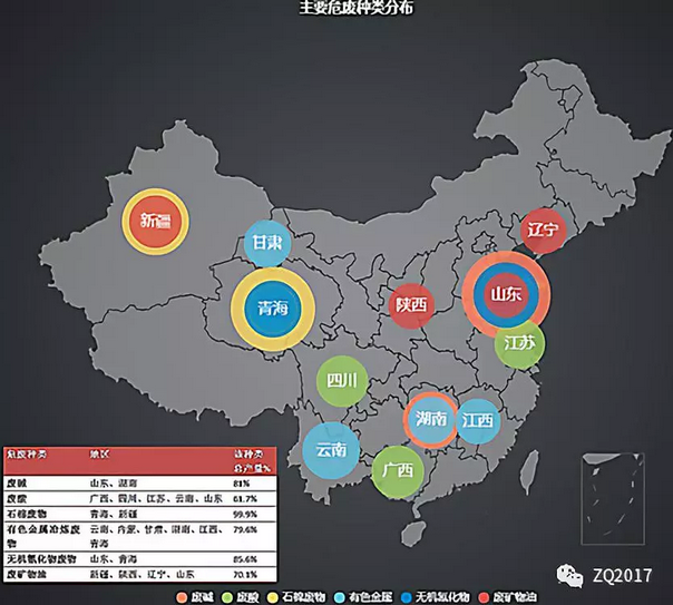 截止2017年底,我國危廢的產(chǎn)量達(dá)到6936.89萬噸,盡管我國2017年底核準(zhǔn)的危廢生產(chǎn)資質(zhì)規(guī)模達(dá)到8178萬噸/年,但實(shí)際的處理規(guī)模僅僅占危廢產(chǎn)量的1/3,缺口龐大。從地區(qū)來看,我國的工業(yè)危廢主要集中在京津冀-山東、長三角、遼沈一帶、西南重工業(yè)區(qū)等地域,其中山東、江蘇、湖南、浙江、內(nèi)蒙古、四川、廣東、廣西、吉林和新疆的危廢產(chǎn)量之和占上報(bào)總量的1/3。根據(jù)廣發(fā)證券分析,目前處理缺口比較大大的區(qū)域包括山東、湖南、青海以及新疆一帶。