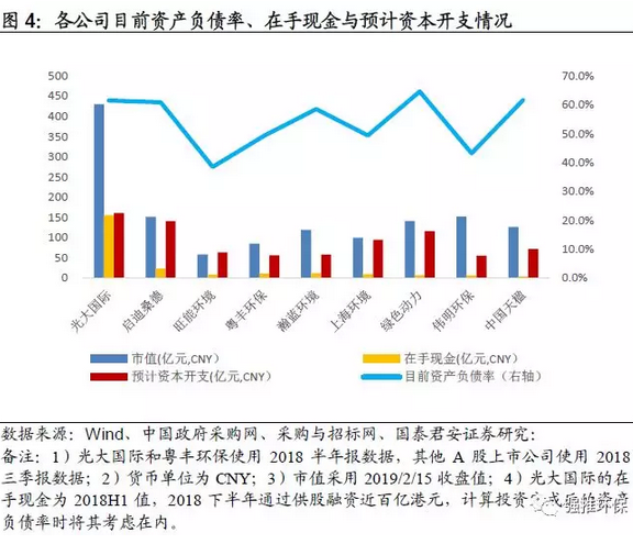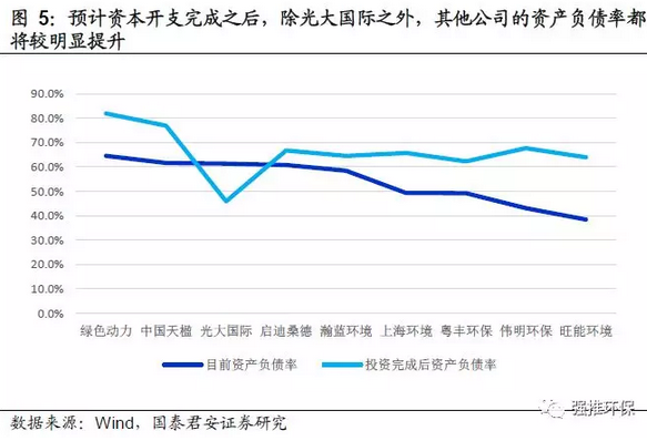 預計的資本開支完成之后資產(chǎn)負債率的計算方法:1)根據(jù)各公司目前的資產(chǎn)負債率和在手現(xiàn)金情況,假設不進行新的股權融資,所有在手現(xiàn)金都投入新項目建設,保守按照目前我們有統(tǒng)計數(shù)據(jù)的項目的平均資本金投入為28%來計算,預計除光大國際以外的其他公司新項目所需資本金投入都大于目前在手現(xiàn)金,因此統(tǒng)一假設項目除了在手現(xiàn)金投入的部分以外,都使用銀行貸款,我們對預計資本開支完成之后,公司的資產(chǎn)負債率水平進行測算;2)由于各公司都有部分項目已經(jīng)在建,相應的負債已體現(xiàn)在了目前的資產(chǎn)負債表中,且在手所有項目并非在同一時間內(nèi)開始投資,因此我們的計算結果將高于實際水平。