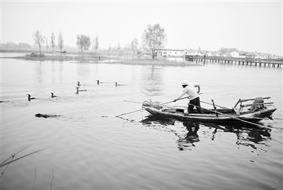 白洋淀淀區(qū)今后將全面禁止網(wǎng)箱養(yǎng)魚,并加大增殖放流力度。圖為淀區(qū)漁民正在訓(xùn)練鸕鶿捕魚,這一項目既可增加漁民收入,也可作為淀區(qū)休閑漁業(yè)的表演項目。 趙威攝