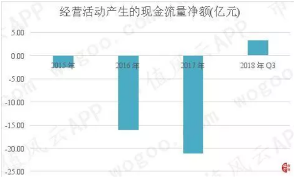 盛運環(huán)保2015年至2018年前3季度,經(jīng)營活動產(chǎn)生的現(xiàn)金流量凈額分別為-2.51億元、-16.08億元、-21.14億元和3.34億元,累計金額為-36.39億元,換句話說,公司的經(jīng)營活動并沒有給公司帶來凈的現(xiàn)金流入,反而加大了公司的現(xiàn)金凈流出。