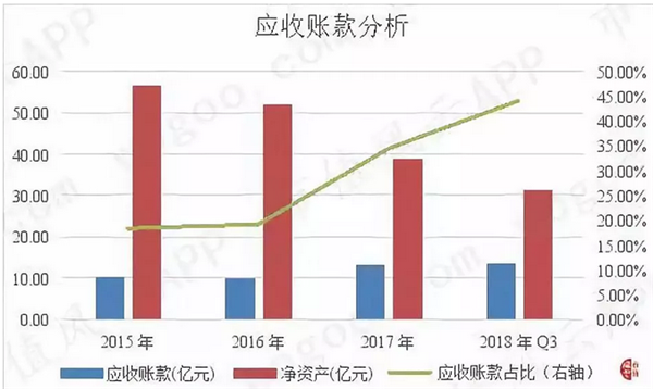 盛運環(huán)保2015年末至2018年3季度末的應收賬款分別為10.38億元、9.96億元、13.39億元和13.73億元,占公司凈資產(chǎn)的比重分別為18.37%、19.10%、34.40%和43.91%,占比持續(xù)增加,一定程度上表明公司的應收賬款催收不力,現(xiàn)金回款質(zhì)量在逐步變差。