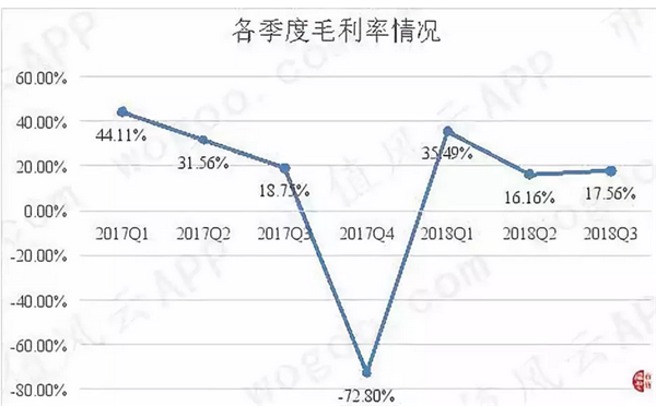 盛運環(huán)保各季度的毛利率波動比較大,比如2017年第一季度的毛利率為44.11%,2018年第一季度的毛利率為35.49%,而2017年第四季度的毛利率為-72.80%,2018年第二、三季度的毛利率分別為16.16%、17.56%,巨幅的毛利率波動說明公司的毛利率存在異常波動。