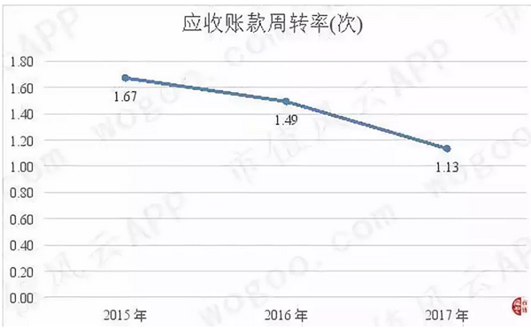 盛運環(huán)保2015年至2017年的應收賬款周轉(zhuǎn)率分別為1.67次、1.49次和1.13次,不斷下滑,說明公司的應收賬款管理能力在持續(xù)下降。