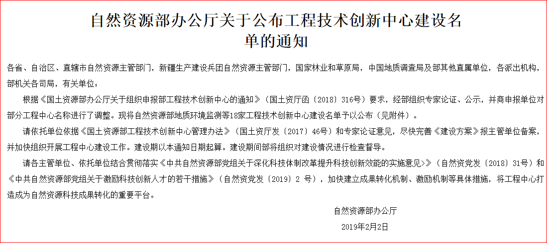 據(jù)了解,2019年2月2日,自然資源部辦公廳公開發(fā)布《自然資源部辦公廳關(guān)于公布工程技術(shù)創(chuàng)新中心建設(shè)名單的通知》,自然資源部工程技術(shù)創(chuàng)新中心建設(shè)名單中,江蘇綠之源生態(tài)建設(shè)有限公司赫然在列。