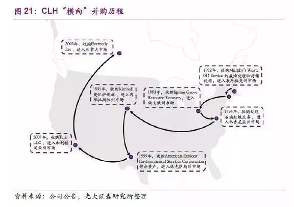 CLH通過(guò)這次并購(gòu)一舉成為美國(guó)最大的危廢處置公司,奠定了危廢行業(yè)新的競(jìng)爭(zhēng)格局。在這次行業(yè)洗牌中,傳統(tǒng)巨頭企業(yè)受到的沖擊較大,由于體量較大較難通過(guò)適時(shí)的調(diào)整及時(shí)止損,而受沖擊較小的中小企業(yè)反而通過(guò)合理并購(gòu)成為新巨頭,如CLH。