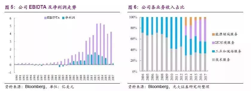 除傳統(tǒng)的技術(shù)服務(wù)之外,公司還提供SK環(huán)境及性能產(chǎn)品服務(wù)、工業(yè)和現(xiàn)場(chǎng)服務(wù)、以及能源領(lǐng)域(石油天然氣和住宿)服務(wù)三大業(yè)務(wù),努力向“一站式服務(wù)”的服務(wù)提供商靠攏。其中,前兩種業(yè)務(wù)和傳統(tǒng)的技術(shù)服務(wù)共同構(gòu)成了公司的核心增長(zhǎng)動(dòng)力,三者營(yíng)業(yè)收入占比高達(dá)96%;而能源領(lǐng)域服務(wù)在未來(lái)有望隨著美國(guó)頁(yè)巖氣革命的發(fā)展給公司帶來(lái)新的增量。