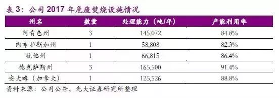危廢焚燒方面,公司擁有北美共13個(gè)商業(yè)危險(xiǎn)廢物焚化爐中的9個(gè),是北美這類(lèi)設(shè)施的最大運(yùn)營(yíng)商。公司垃圾焚燒實(shí)際處理能力為561,721噸,2017年的平均使用率為87.6%。