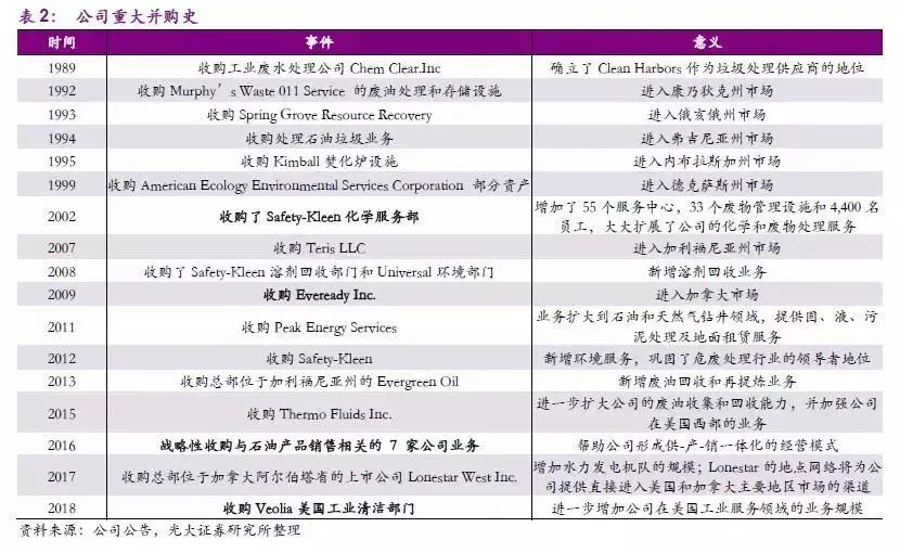 公司上在原有危廢處理技術(shù)的基礎(chǔ)上,通過(guò)兼并收購(gòu)增添一系列新的服務(wù)領(lǐng)域。2008年,公司通過(guò)收購(gòu)Safety-Kleen 溶劑回收部門(mén)和Universal 環(huán)境部門(mén),開(kāi)始涉足溶劑回收市場(chǎng),新增大量業(yè)務(wù)。2009年,公司收購(gòu)Eveready,在進(jìn)軍加拿大市場(chǎng)的同時(shí),擴(kuò)大了公司能源和工業(yè)服務(wù)范圍。能源和工業(yè)部門(mén)為石油和天然氣勘探和生產(chǎn),煉油,石化,紙漿和造紙以及電力公用事業(yè)終端市場(chǎng)等提供一系列服務(wù)。此前,Clean Harbors 在這一領(lǐng)域的傳統(tǒng)業(yè)務(wù)相對(duì)較小,收購(gòu)Eveready 將公司的能源和工業(yè)服務(wù)收入從3千萬(wàn)增加到5.5~6億,使其從一個(gè)小眾玩家成長(zhǎng)為了市場(chǎng)上該項(xiàng)業(yè)務(wù)強(qiáng)有力的競(jìng)爭(zhēng)對(duì)手。2011年,公司收購(gòu) Peak Energy Services,提供固、液、污泥處理及地面租賃服務(wù),將業(yè)務(wù)擴(kuò)大到石油和天然氣鉆井領(lǐng)域。2012年,公司收購(gòu)北美領(lǐng)先的廢油回收和再精煉、零件清潔及環(huán)境解決方案公司Safety-Kleen,是公司歷史上最大規(guī)模收購(gòu)。對(duì)Safety-Kleen的并購(gòu)使得公司成為北美最大的二手油重磨機(jī)和回收商。此次收購(gòu)新增了環(huán)境服務(wù)業(yè)務(wù),進(jìn)一步鞏固了公司危廢處理行業(yè)的領(lǐng)導(dǎo)者地位。公司在2013年和2015年相繼收購(gòu)了總部位于加利福尼亞州的Evergreen Oil 及 Thermo Fluids Inc.,提升公司廢油回收和再精煉能力,進(jìn)一步增強(qiáng)業(yè)務(wù)能力。