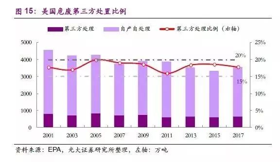 (2)第三方處理比例較低。在1990年后,政府對(duì)危廢的監(jiān)管進(jìn)一步趨嚴(yán),單純的通過(guò)第三方處置對(duì)于有大量危廢產(chǎn)出的企業(yè)來(lái)說(shuō)成本過(guò)高,加上危廢處理技術(shù)的進(jìn)一步成熟,促使眾多大型化工企業(yè)采用自行處理危廢的方式消納危廢產(chǎn)出。從2001年起,美國(guó)危廢的場(chǎng)外處理量(Waste received fromoff-Site,即接收從場(chǎng)外運(yùn)送進(jìn)處理廠(chǎng)內(nèi)的危廢,基本等同于第三方處置量)穩(wěn)定在15%到20%之間,在危廢產(chǎn)量基本穩(wěn)定的情況下,第三方處置危廢企業(yè)可以分到的蛋糕其實(shí)十分有限,這也激發(fā)了危廢處置企業(yè)開(kāi)拓新業(yè)務(wù)的需求。