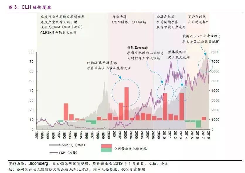 公司在成立后的近40年里,通過(guò)大大小小近40余次外延并購(gòu),在增加危險(xiǎn)廢物處理設(shè)施的數(shù)量和覆蓋區(qū)域、擴(kuò)大業(yè)務(wù)服務(wù)范圍的同時(shí),也致力于增添新的涵蓋多個(gè)行業(yè)和業(yè)務(wù)類(lèi)型的服務(wù)領(lǐng)域、擴(kuò)大服務(wù)種類(lèi),最終從一家小型油罐清潔公司成長(zhǎng)為北美領(lǐng)先的環(huán)境和工業(yè)服務(wù)提供商和最大的危險(xiǎn)廢物處理公司。尤其是在美國(guó)危廢行業(yè)十年調(diào)整蕭條期的時(shí)候,通過(guò)一次次并購(gòu),公司不僅生存了下來(lái),還改變了市場(chǎng)格局,逐漸成為行業(yè)龍頭??v觀(guān)公司整個(gè)并購(gòu)過(guò)程,可以大致分為三個(gè)階段。