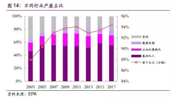 (1)危廢行業(yè)較依賴(lài)工業(yè),尤其是化工和油氣行業(yè)的發(fā)展。美國(guó)不同行業(yè)對(duì)危廢產(chǎn)量的貢獻(xiàn)度上,基礎(chǔ)化工制造業(yè)占比常年超50%,石油和煤制品制造業(yè)以及廢物處理行業(yè)也穩(wěn)居前三,且近20年來(lái),排名前三和前十的行業(yè)的危廢產(chǎn)量占比在穩(wěn)步提高,進(jìn)一步推動(dòng)了行業(yè)集中度的提升。