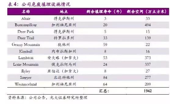 危廢填埋方面,公司在美國(guó)和加拿大共擁有11個(gè)活躍的垃圾填埋場(chǎng),其中兩個(gè)是非商業(yè)垃圾填埋場(chǎng),他們只接受來(lái)自公司焚化爐的垃圾。其余9個(gè)均為商業(yè)用垃圾填埋場(chǎng),7個(gè)允許用于處置危險(xiǎn)廢物,另2個(gè)用于非處置危險(xiǎn)工業(yè)垃圾處理和城市固體垃圾處理。目前,這些商用垃圾填埋場(chǎng)的仍有約1942萬(wàn)立方米的剩余容量。