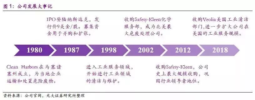 Clean Harbors(以下簡(jiǎn)稱(chēng)“CLH”)成立于1980年,公司最初是區(qū)域性收集廢物的小企業(yè),后來(lái)逐步發(fā)展成為專(zhuān)業(yè)化危廢處置公司。CLH通過(guò)并購(gòu)一舉成為美國(guó)最大的危廢處置公司,奠定了危廢行業(yè)新的競(jìng)爭(zhēng)格局,現(xiàn)在是美國(guó)規(guī)模最大的第三方危廢處理公司。