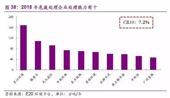 目前我國(guó)危廢市場(chǎng)的優(yōu)秀參與者眾多,隨著危廢處理“量?jī)r(jià)齊增”的情況延續(xù),從傳統(tǒng)危廢處理企業(yè)東江環(huán)保、光大綠色環(huán)保,到全產(chǎn)業(yè)鏈拓展的大型環(huán)保公司東方園林、北控水務(wù),再到資金實(shí)力雄厚的新興力量海螺創(chuàng)業(yè)、雅居樂(lè),均在危廢行業(yè)持續(xù)開(kāi)疆拓土。但是,我國(guó)的危廢市場(chǎng)行業(yè)集中度仍相對(duì)較低。根據(jù)E20環(huán)境平臺(tái)的統(tǒng)計(jì),雖然我國(guó)的危廢企業(yè)處理量快速增長(zhǎng),但是CR10的總產(chǎn)能僅占全國(guó)總產(chǎn)能的7.2%,仍有大量的危廢產(chǎn)能被小型企業(yè)所瓜分。