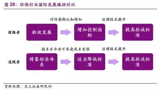 以美國(guó)為首的發(fā)達(dá)國(guó)家的環(huán)保意識(shí)隨著工業(yè)的大力發(fā)展率先覺(jué)醒,開(kāi)始針對(duì)工業(yè)污染物制定相關(guān)標(biāo)準(zhǔn)。隨著對(duì)污染物的認(rèn)知上升,行業(yè)標(biāo)準(zhǔn)趨于嚴(yán)格,技術(shù)規(guī)范性也逐步提高。到二十世紀(jì)90年代,發(fā)達(dá)國(guó)家的探路者之旅已經(jīng)基本形成。以中國(guó)為代表的發(fā)展中國(guó)家雖然在環(huán)保行業(yè)起步較晚,但卻有一整套行業(yè)標(biāo)準(zhǔn)和技術(shù)規(guī)范可以借鑒,扮演著追隨者的角色。