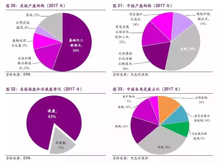從產(chǎn)廢結(jié)構(gòu)上來(lái)看,美國(guó)是石油化工生產(chǎn)大國(guó),其產(chǎn)廢結(jié)構(gòu)中基礎(chǔ)化工以及石油/煤制品制造業(yè)的產(chǎn)廢占比合計(jì)高達(dá)71%(2017年);由于石化企業(yè)多產(chǎn)生液態(tài)危廢,因而美國(guó)的危廢產(chǎn)量中83%為液態(tài)危廢。而我國(guó)的化工行業(yè)產(chǎn)廢僅占總量的19%,且產(chǎn)廢行業(yè)較為分散,有色金屬冶煉、非金屬礦采選、造紙等行業(yè)的產(chǎn)廢占比均超過(guò)10%。另一方面,液態(tài)危廢在國(guó)內(nèi)危廢總體結(jié)構(gòu)中占比較小,以目前的廢物結(jié)構(gòu)看,將廢堿(15.67%)、廢酸(14.37%)、廢油(5.36%)全看作液態(tài)危廢,合計(jì)占比僅為35%。
