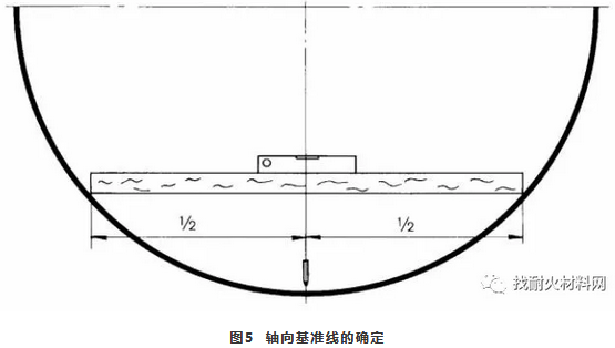 可以防止砌筑時磚環(huán)砌歪和磚列扭曲,同時可以控制耐火磚的磚縫厚度。首先確定軸向基準線,可以采用水平儀、直尺和鉛錘確定,如圖5所示,軸向基準線每隔1.5m畫一條,每條與窯的中心線平行;環(huán)向基準線每隔1m畫一條,每條與窯的中心線垂直;