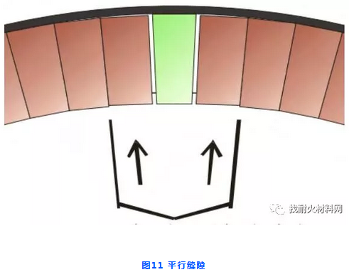 (7)使用鎖磚和鋼板鎖口時需注意,布置好鎖磚和標準磚后,注意觀察磚縫,若磚縫是水平,則在標準磚側(cè)面打入鋼板,不得在鎖磚側(cè)面打入鋼板,如圖11所示:若磚縫是楔型的,此時打入鋼板會導(dǎo)致耐火磚會出現(xiàn)應(yīng)力集中損壞,需要返工,如圖12所示:
