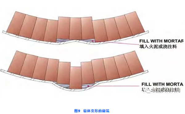 在窯體變形處砌筑時,由于耐火磚不能于窯體貼緊,用耐火泥漿找平后進行砌筑,軸向歪斜的耐火磚側(cè)面不能貼緊,采用耐火泥漿成陶瓷纖維板來調(diào)增,如圖9、10所示: