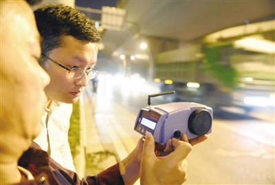 環(huán)保工作人員夜查工地、道路揚(yáng)塵污染。劉斌 攝影