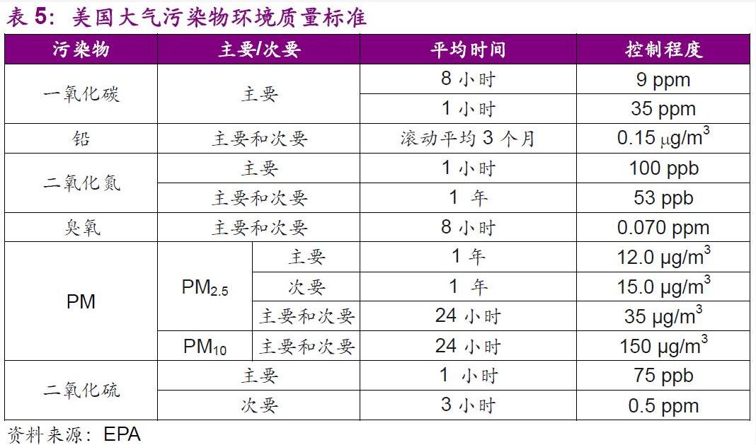 綜上所述,美國的大氣環(huán)保治理隨污染(洛杉磯煙霧、多諾拉事件)而起,通過一系列法律法規(guī)的修訂、全方面污染源的控制、以及特有的排污權(quán)交易體系的建立,較為成功的實現(xiàn)了空氣環(huán)境的治理和顯著改善。在政策和監(jiān)管的雙重壓力下,美國的排污企業(yè)(電廠、鋼企等)多通過自行研發(fā)并安裝脫硫脫硝設(shè)施和優(yōu)化生產(chǎn)技術(shù)的方式實現(xiàn)清潔排放,故美國并沒有大型的專精于脫硫脫硝技術(shù)的大氣環(huán)保類公司。目前,大氣治理行業(yè)在美國的關(guān)注度和市場均處于低位,這與美國目前的工業(yè)企業(yè)產(chǎn)能總量、布局、以及技術(shù)的先進程度有著很大關(guān)系,美國大氣治理行業(yè)目前的側(cè)重點在室內(nèi)空氣污染技術(shù)優(yōu)化和設(shè)備創(chuàng)新上,相關(guān)公司也多為小型的專注于室內(nèi)空氣污染解決方案和設(shè)備銷售的公司。