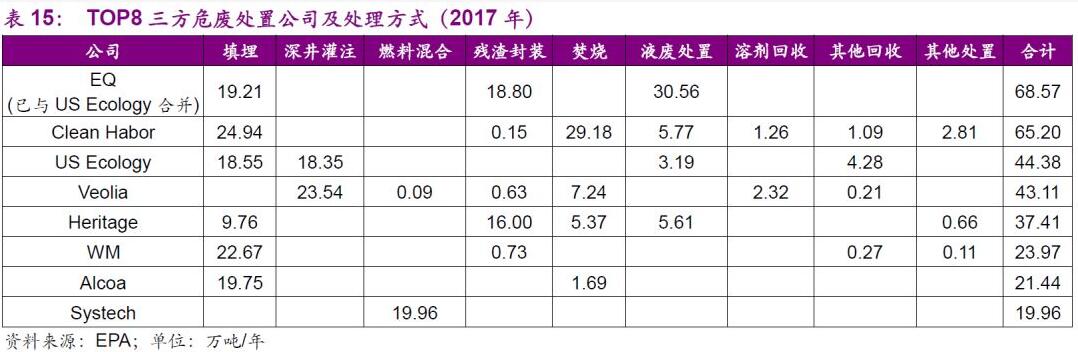 行業(yè)成熟(2000至今)。進入21世紀(jì)后,危廢行業(yè)走向成熟,危廢的產(chǎn)量和處理量從2001年起均相對穩(wěn)定。危廢產(chǎn)量方面,美國的危廢產(chǎn)量和美國的工業(yè)結(jié)構(gòu)調(diào)整和大力推進清潔生產(chǎn)有著較強的關(guān)聯(lián)度,21世紀(jì)后危廢產(chǎn)量基本保持穩(wěn)定;同時伴隨美國頁巖油氣革命,使危廢處理需求維持,現(xiàn)場服務(wù)、環(huán)境修復(fù)需求興起。危廢處理量方面,整體的產(chǎn)能規(guī)劃更為合理,產(chǎn)能富余量穩(wěn)步減少,行業(yè)的危廢處理量和危廢處理機構(gòu)數(shù)量都在穩(wěn)步減少,同時行業(yè)的集中度也在持續(xù)走高。