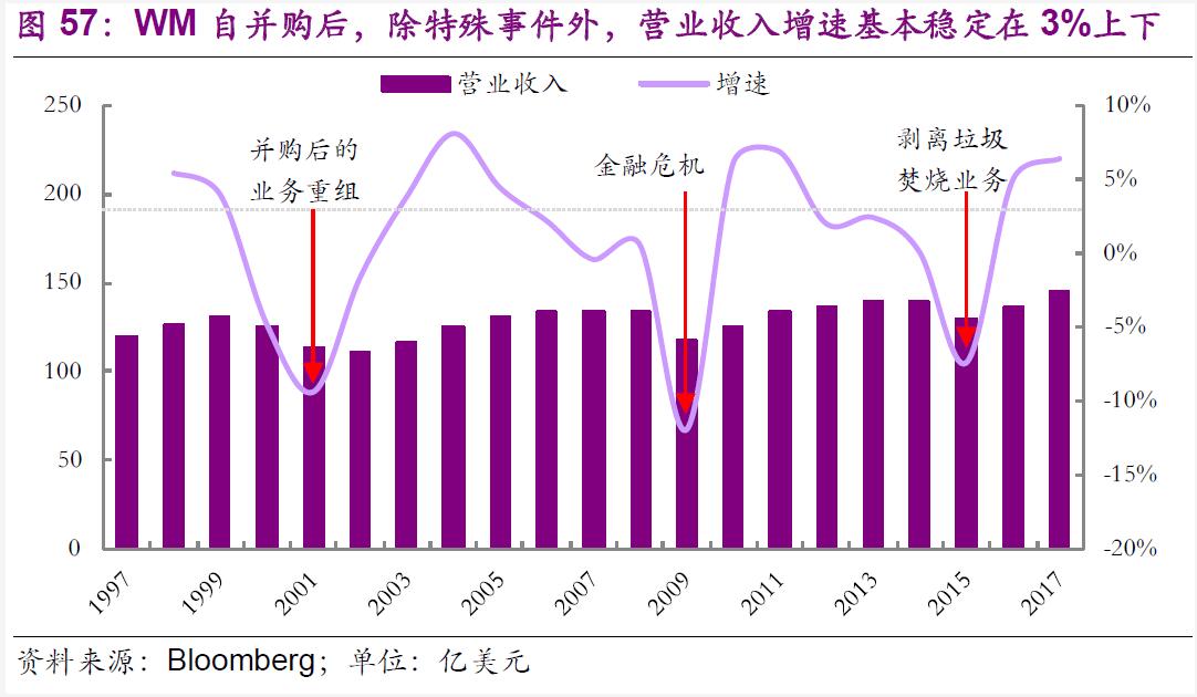 外因內(nèi)策聯(lián)動,助力公司發(fā)展。外因方面,美國居民消費支出增長帶動固廢產(chǎn)生量從1960年的560萬噸提升到1990年的2.08億噸;1970年前后,《固體廢物處置法》等法規(guī)的出臺催化行業(yè)向規(guī)范化標(biāo)準(zhǔn)化成長;固廢處置的成熟技術(shù)發(fā)展為固廢綜合管理提供有力支撐,而環(huán)保意識的逐漸完善則成為行業(yè)資源化、精細(xì)化處理轉(zhuǎn)型的決定性因素,帶動美國垃圾填埋處理占比從1960年的90%以上下降至2010年的54%,回收利用處理占比則從1960年的6%提升到2010年的34%。內(nèi)策方面,在對的時機采取對的兼并收購策略,先是幫助WM在行業(yè)高速發(fā)展階段通過140余次收購搶占市場份額,成為行業(yè)龍頭;在改變公司歷史的1998年的WM/UW合并后,又通過數(shù)十次大體量的核心業(yè)務(wù)收購進一步穩(wěn)固公司市場份額,以及數(shù)十次專業(yè)化新業(yè)務(wù)的收購?fù)瓿尚屡d業(yè)務(wù)開拓轉(zhuǎn)型,帶動公司實現(xiàn)新一輪騰飛。