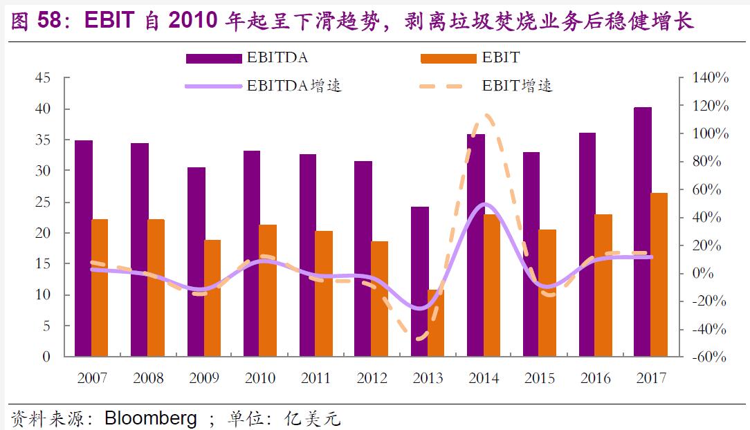 公司2017年垃圾處理量高達1.13億噸,實現(xiàn)營業(yè)收入145億美元,EBIT和EBITDA分別為26和40億美元。公司2017年固廢營業(yè)收入居全球第一,領(lǐng)先第二名威立雅達70%,而這一切都建立在公司僅在美國和加拿大運營的基礎(chǔ)上,充分展現(xiàn)出公司在固廢領(lǐng)域的絕對統(tǒng)治力。