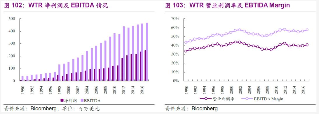 我們對WTR股價進行了復(fù)盤,為了較為明顯的展示收益特點,我們將其分為3個階段,第一階段,公司開始大規(guī)模的并購且進入收入和凈利潤快速增長期,此階段,公司較好的跑贏指數(shù);第二階段2000-2009年,公司營業(yè)收入和凈利潤增長為2.48和1.95倍,這個階段是公司成長最快的階段,股價最高峰漲幅接近3.5倍,雖然后受金融危機影響,但該過程實現(xiàn)了較多的超額收益;第三階段,由于前期股價漲幅較快公司估值并不具備優(yōu)勢,雖也體現(xiàn)了水務(wù)公司的公用事業(yè)屬性,漲幅雖然較好但未跑贏指數(shù)。