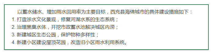 西充縣于今年2月出臺了《西充縣海綿城市建設計劃》及建設項目計劃,確定了到2020年達成目標:70%的年徑流總量控制率。