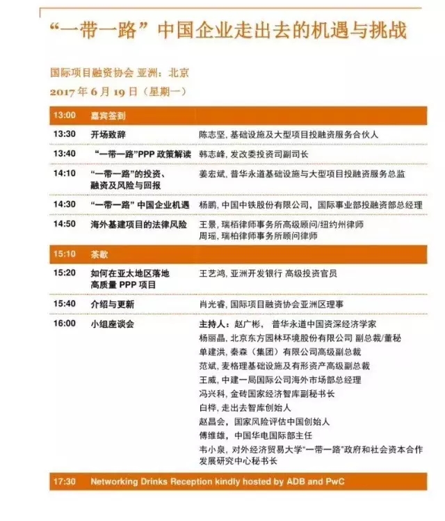 由IPFA的兩個(gè)會(huì)員機(jī)構(gòu)亞洲開(kāi)發(fā)銀行和普華永道PwC聯(lián)合舉辦,邀請(qǐng)來(lái)自國(guó)家發(fā)展改革委、國(guó)際金融機(jī)構(gòu)、咨詢(xún)公司、律師事務(wù)所、智庫(kù)和中國(guó)企業(yè)等嘉賓,共同討論快速發(fā)展的國(guó)內(nèi)PPP市場(chǎng)和激增的走出去需求所帶來(lái)的機(jī)遇和挑戰(zhàn),并向中國(guó)公司提供政策解讀和專(zhuān)業(yè)建議。參加活動(dòng)的發(fā)言嘉賓,個(gè)個(gè)堪稱(chēng)重量級(jí),如發(fā)改委投資司副司長(zhǎng)韓志鋒,亞行高級(jí)投資官員王藝?guó)櫍杖A永道基礎(chǔ)設(shè)施與大型項(xiàng)目投融資服務(wù)總監(jiān)姜宏斌,中國(guó)中鐵股份公司國(guó)際事業(yè)部投融資部總經(jīng)理?xiàng)铢i等等。